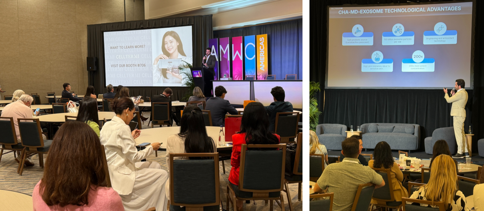 AMWC에서는 알테어 메노쏘(Dr. Altair Menosso) 교수와 함께 워크숍을 진행했다. ‘유산균 유래 엑소좀의 임상 활용과 미용 재생 분야 적용 사례’를 주제로 발표하고 참석자들과 토의 시간을 가졌다. 이어 ‘근거 기반의 유산균 유래 엑소좀 임상 적용’을 주제로 실제 임상 데이터와 활용 전략을 소개했다.