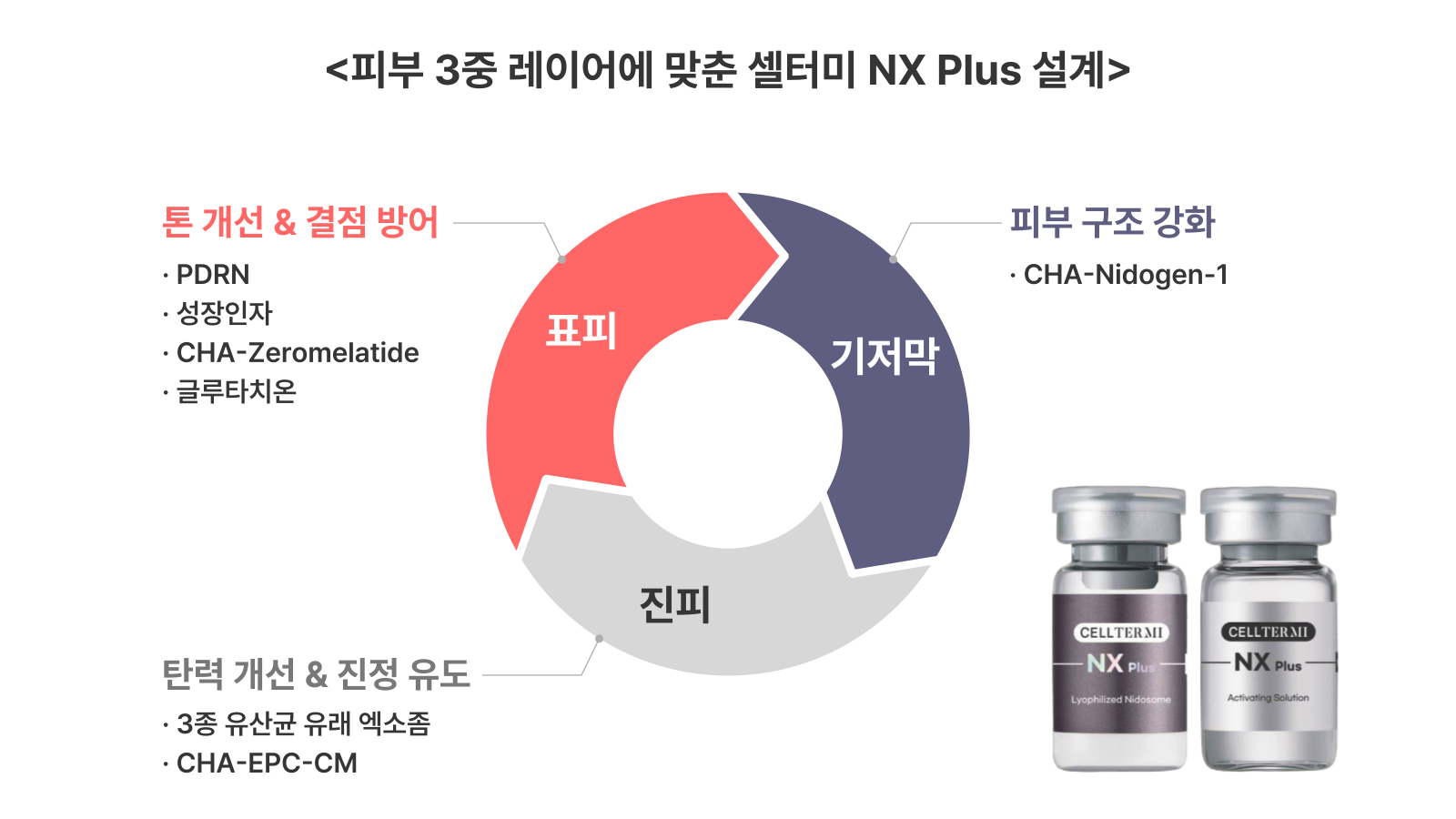 이와 함께 스킨부스터 신제품 ‘셀터미 NX Plus’도 처음 공개했다. 이 제품은 기저막 주요 단백질 니도겐(Nidogen-1)과 차메디텍이 독자 성분으로 특허를 받은 유산균 유래 엑소좀 3종을 적용한 것이 특징이다. 피부 구조를 구성하는 표피·진피·기저막에 모두 작용해 전반적인 피부 컨디션 개선을 돕는다.
