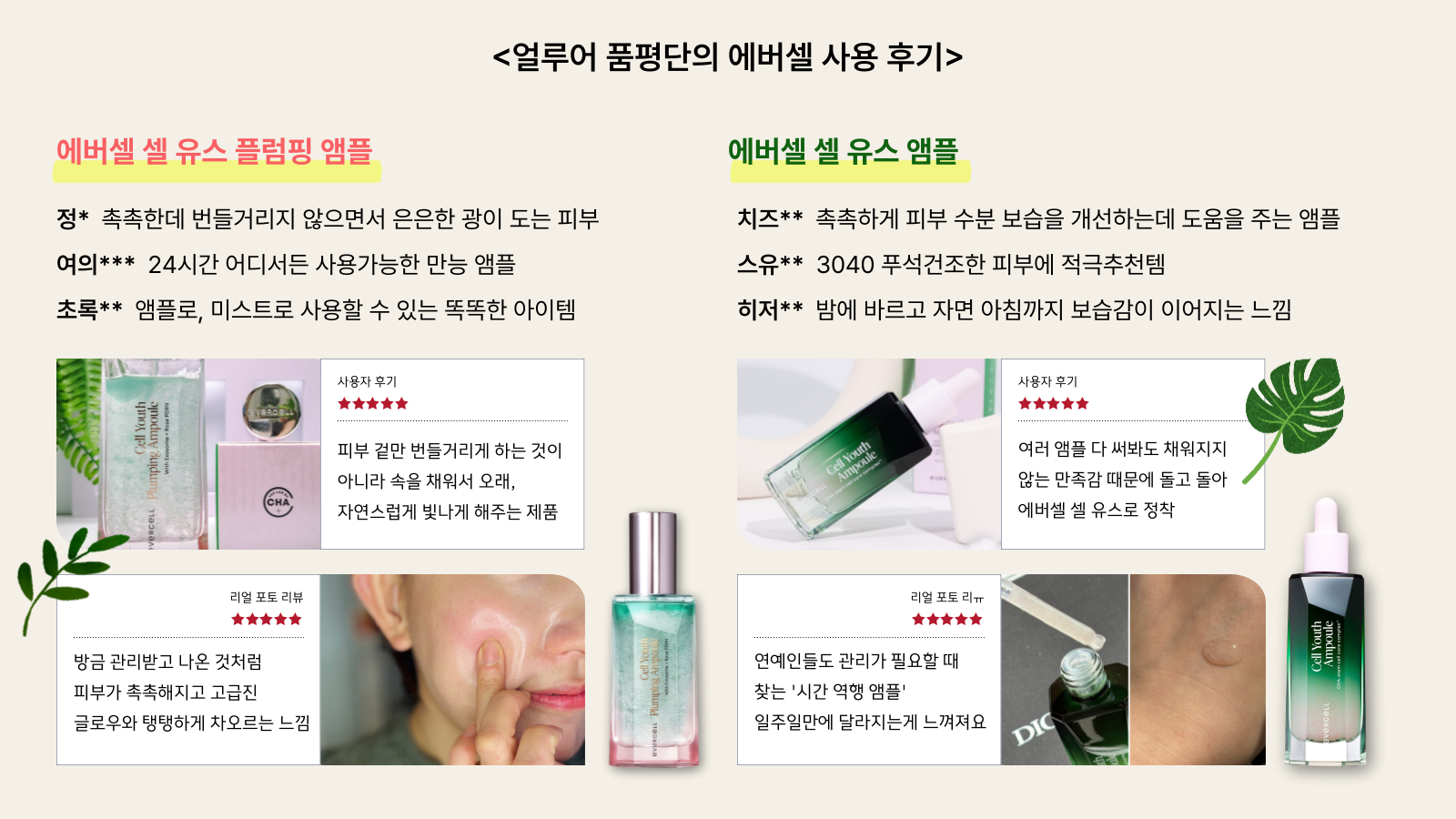 이 가운데 소비자와 메이크업 전문가들로부터 꾸준한 사랑을 받아온 ‘에버셀 셀 유스 앰플’과 최근 출시된 ‘에버셀 셀 유스 플럼핑 미스트 앰플’이 뷰티 매거진 얼루어 코리아의 ‘얼루어 200인 품평단’으로부터 긍정적인 평가를 받으며 제품력을 다시 한 번 입증했다.