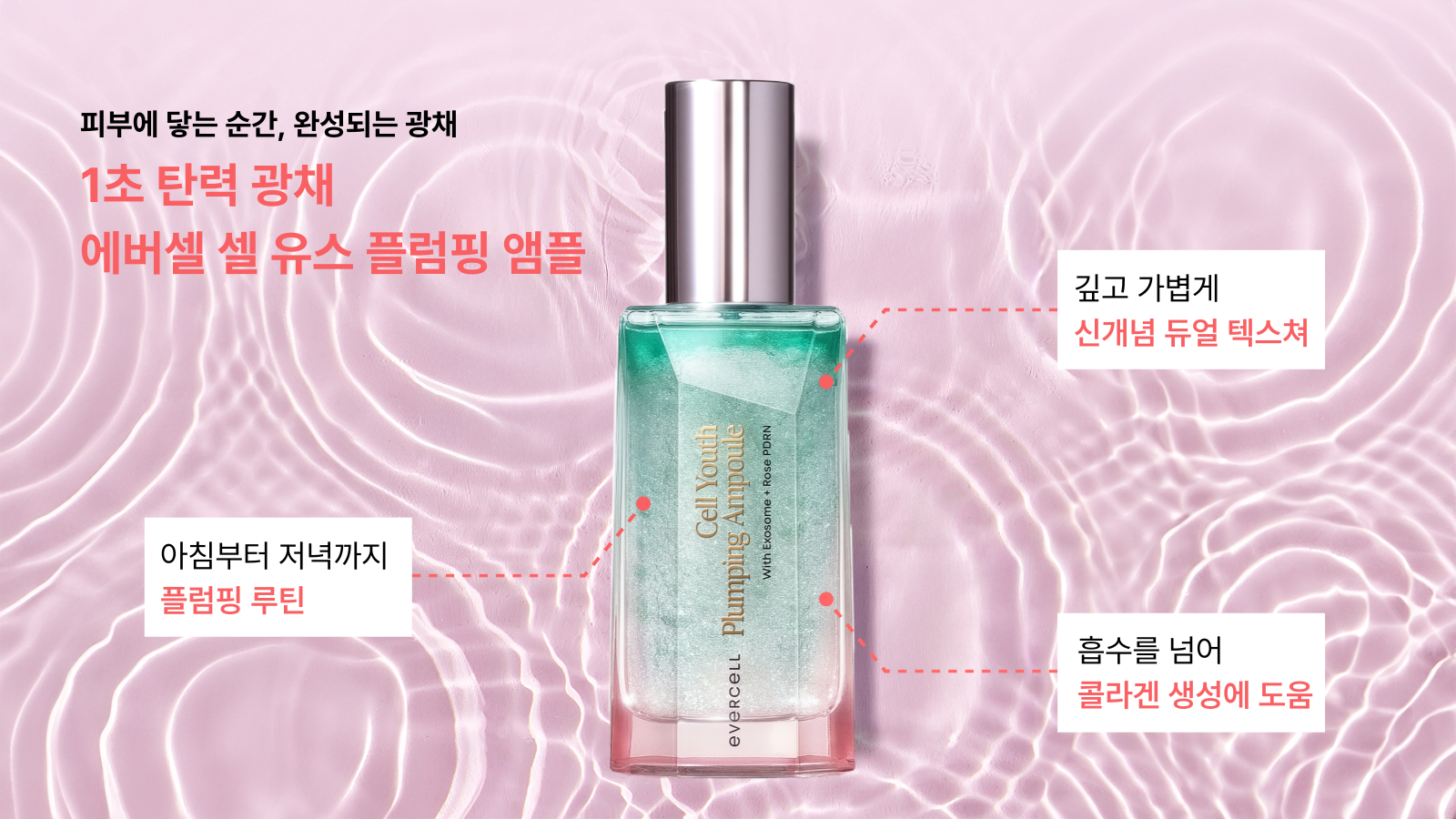 생체외세포 시험 결과, 에버셀 셀 유스 플럼핑 앰플을 사용하면 세포 내 콜라겐을 생성이 134.3% 증가한 것으로 나타났다. 또, 고분자 히알루론산을 20번 압축해 모공보다 작은 크기로 만들어 수분을 피부 속 깊은 곳까지 전달해 수분광을 완성하고, 스쿠알란 오일이 보호막처럼 감싸 수분 증발을 막아준다.