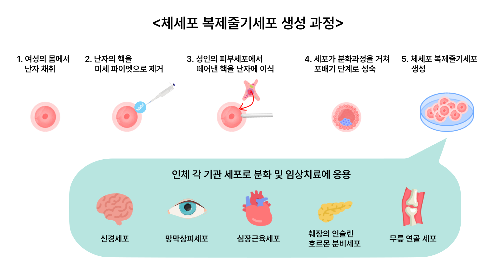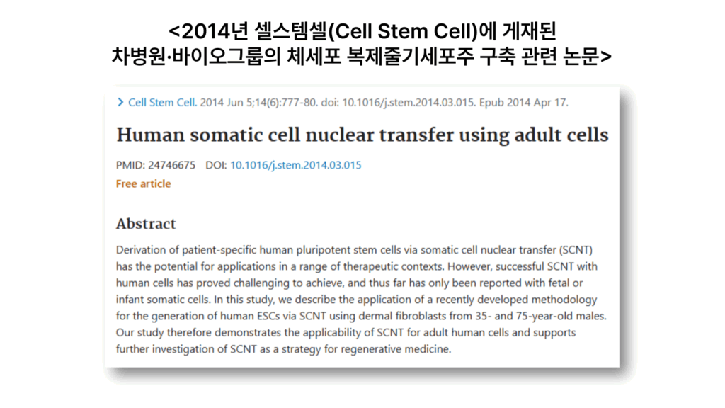 차병원·차바이오그룹은 2014년 세계 최초로 성인의 체세포를 이용해 체세포 복제 배아줄기세포주(NT-ESC)를 확립하는 데 성공했다. 체세포 복제 배아줄기세포는 체세포를 핵이 제거된 난자와 결합해 초기 배아를 형성하고, 모든 조직으로 분화 가능한 줄기세포를 만드는 기술이다. 이 기술을 활용하면 환자의 유전적 정보를 그대로 보유한 맞춤형 배아줄기세포를 제작할 수 있다.