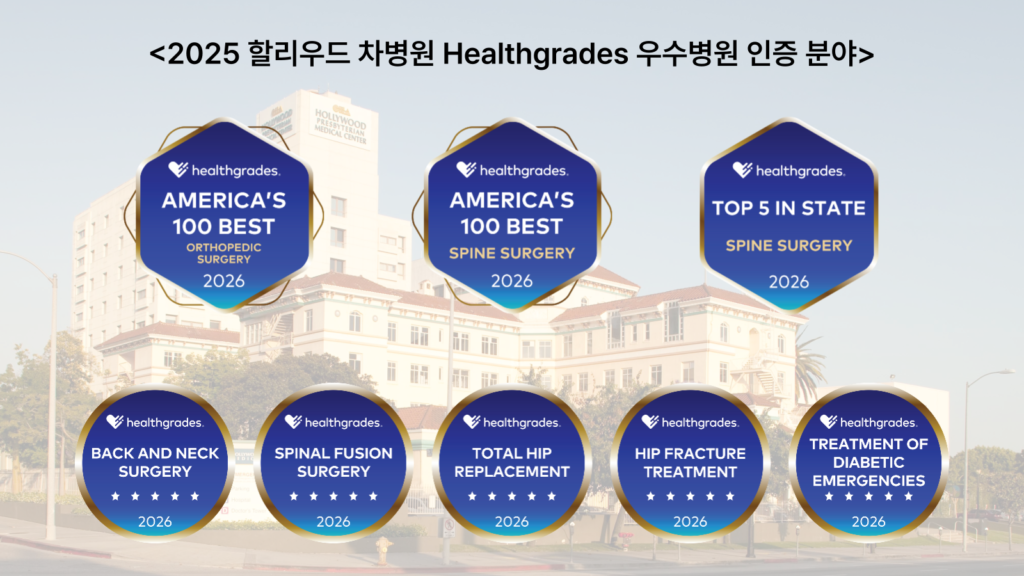 할리우드 차병원은 올해 정형외과와 척추 수술, 두 개 분야에서 ‘미국 100대 우수 병원’에 선정됐으며, 이 중 척추 수술 분야는 2020년부터 6년 연속 ‘100대 우수 병원’에 선정되는 쾌거를 이뤘다. 또 캘리포니아 지역 5대 척추 수술 우수 병원 부문에도 선정됐다.