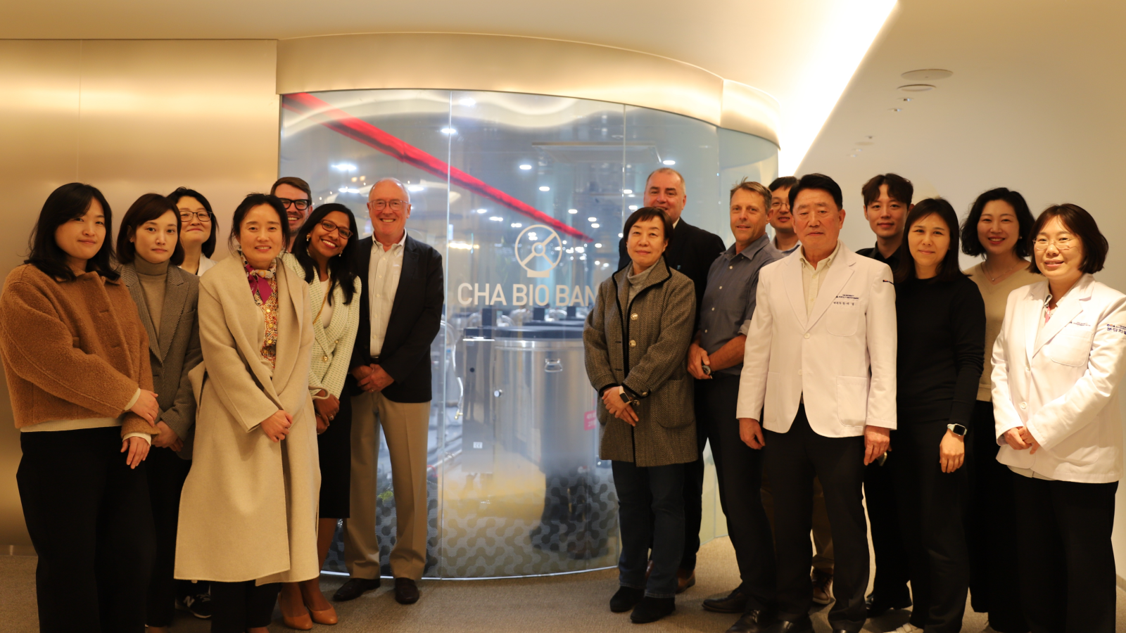 차 여성의학연구소 마곡 난임센터에 있는 바이오뱅크 앞에서 기념사진을 촬영했다.>