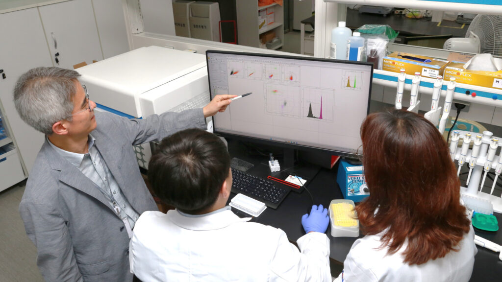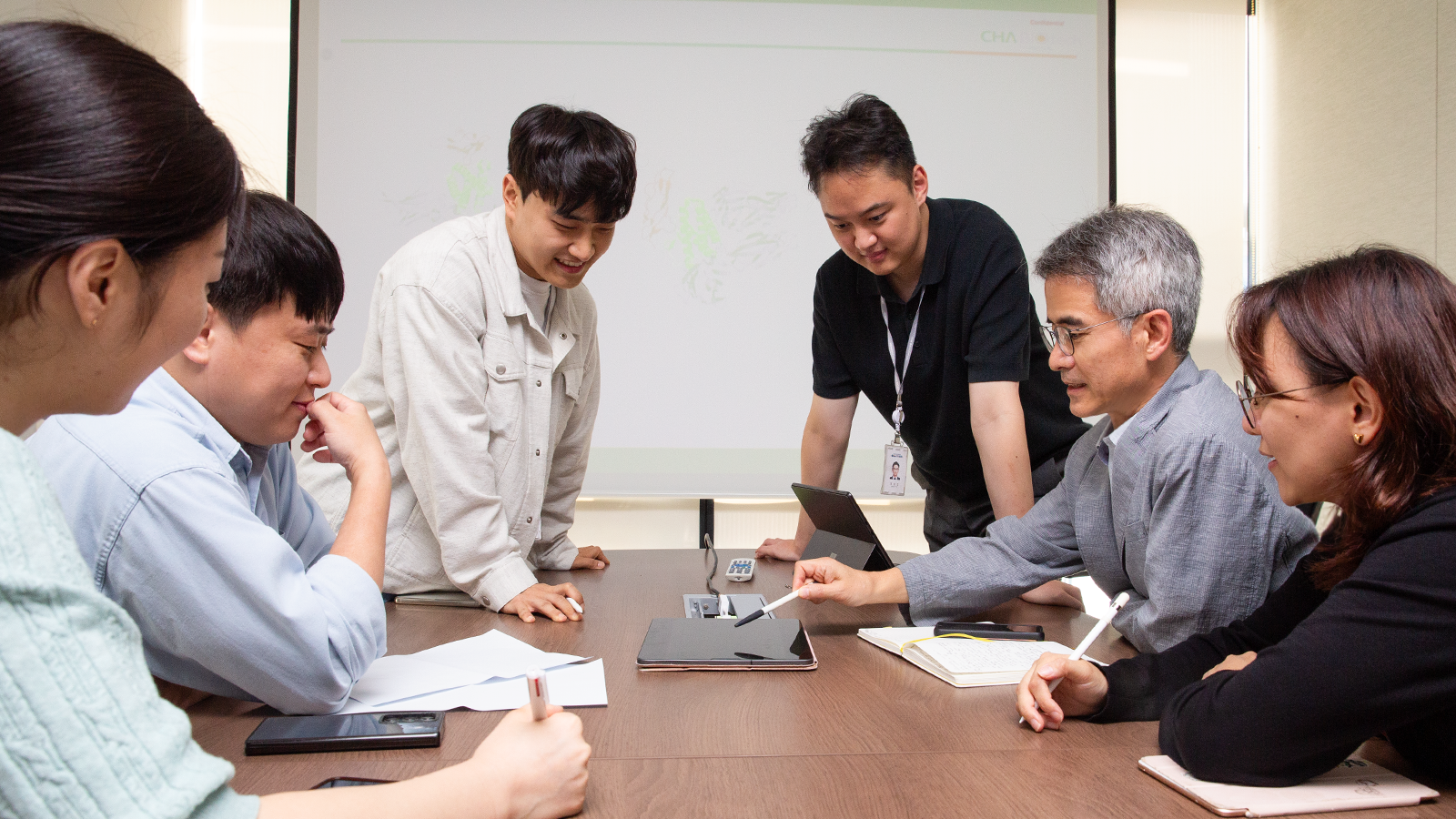 <배동구 전무와 TPP팀 연구원들이 “CHAB-101 후보물질의 효능평가를 위한 유세포”분석 결과에 대해 논의하고 있다.>