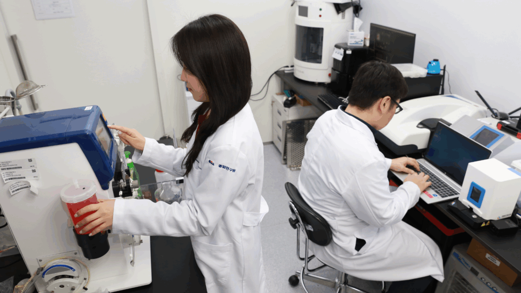 (오른쪽) EV센터 연구원들이 정제한 엑소좀의 단백체를 분석하고 있다>
