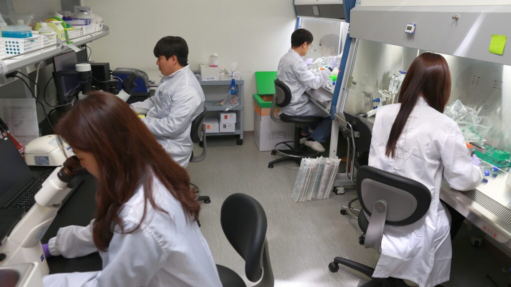 <(왼쪽)면역세포센터 연구원들이 제조한 T세포의 특성을 분석하고 있다