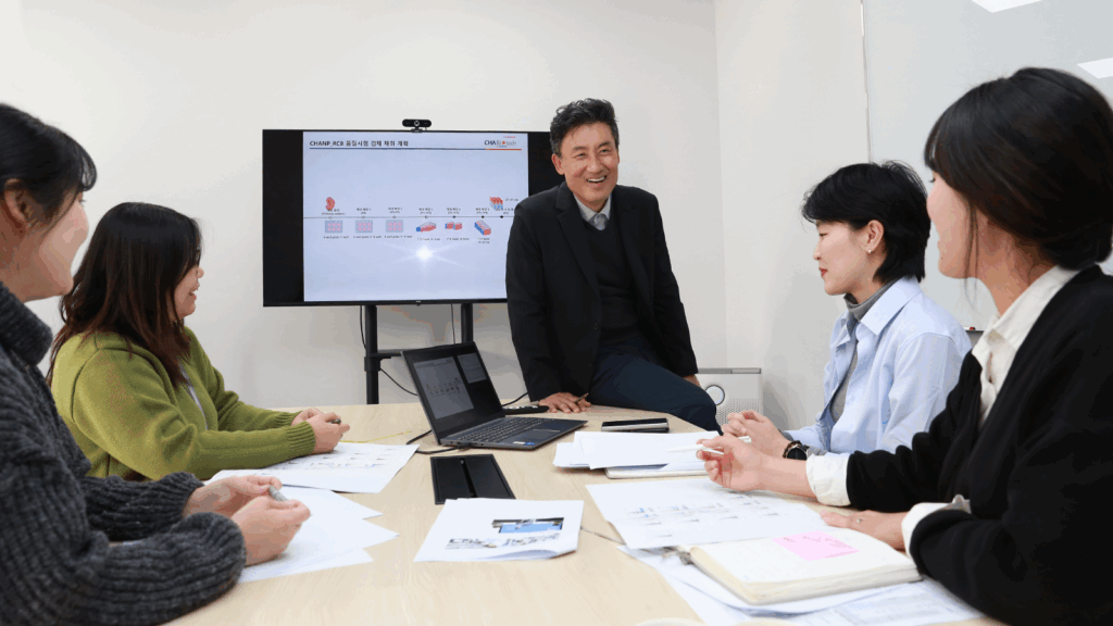 <진현탁 전무가 연구원들과 차별화된 세포 분화 기술 개발에 대해 논의하고 있다>