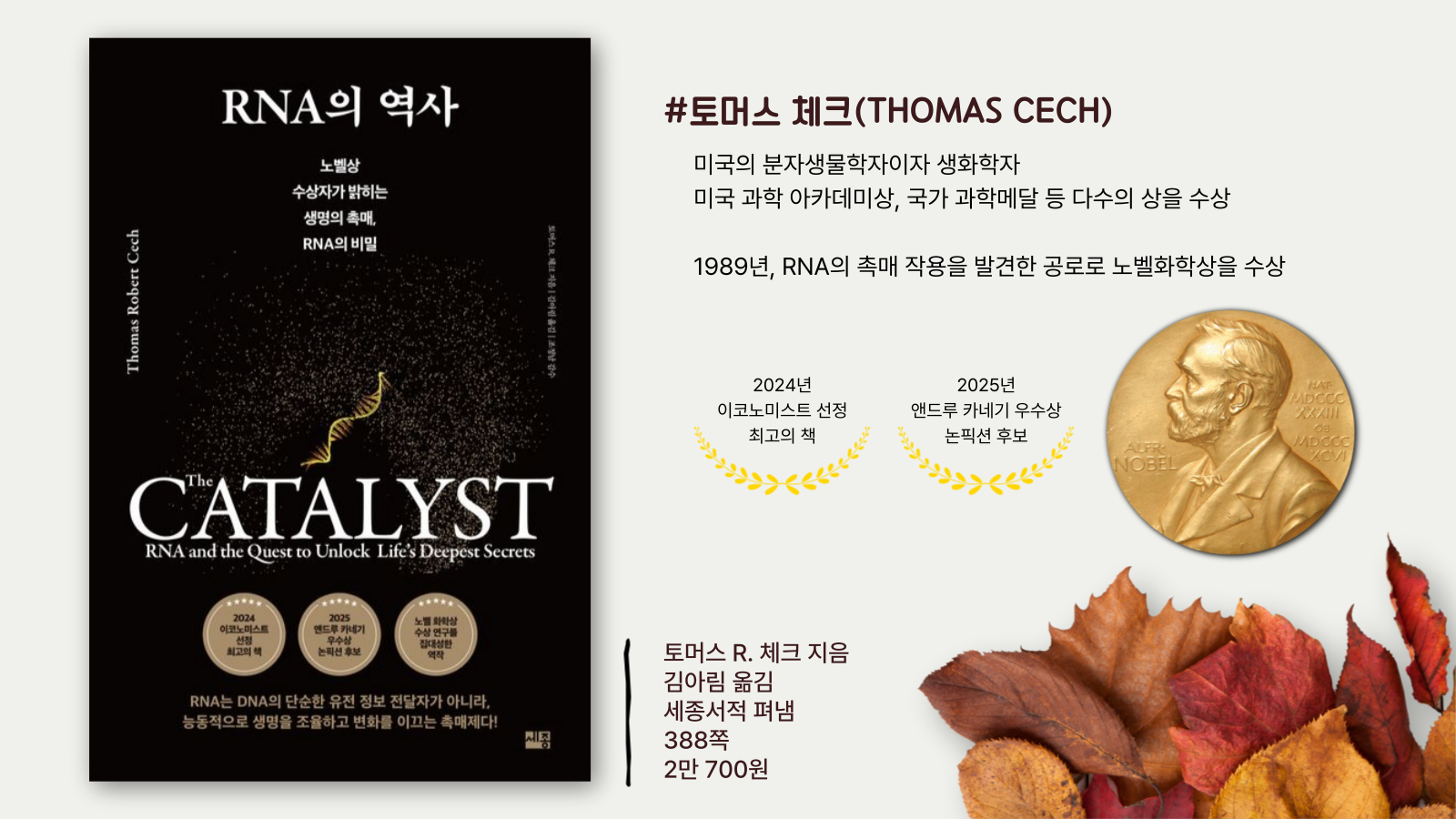 『RNA의 역사』는 1989년 RNA의 촉매 기능(리보자임)을 발견해 노벨 화학상을 받은 토머스 체크(Thomas Cech)가 자신의 반세기 연구 여정을 담은 책이다.