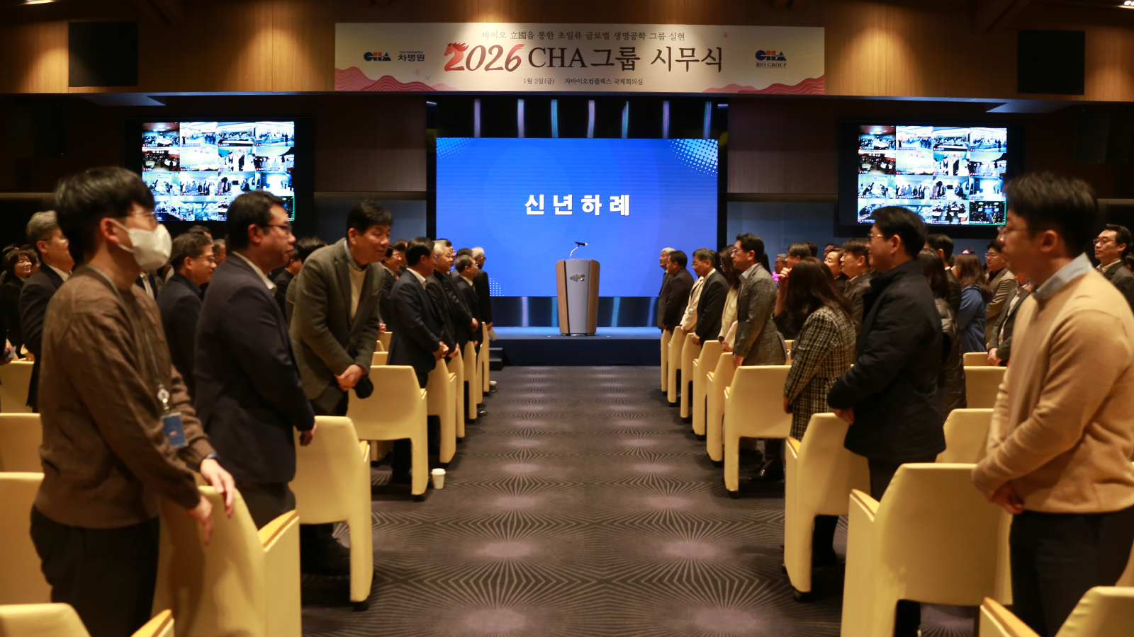 2일 오전 판교 차바이오컴플렉스에서 열린 차병원∙차바이오그룹 시무식에는 병원과 기업, 연구원, 차 의과학대학교 임직원들이 참석했다. 현장에는 주요 임원과 보직자, 수상자들이 자리했으며, 전체 임직원들은 온라인으로 동참했다.